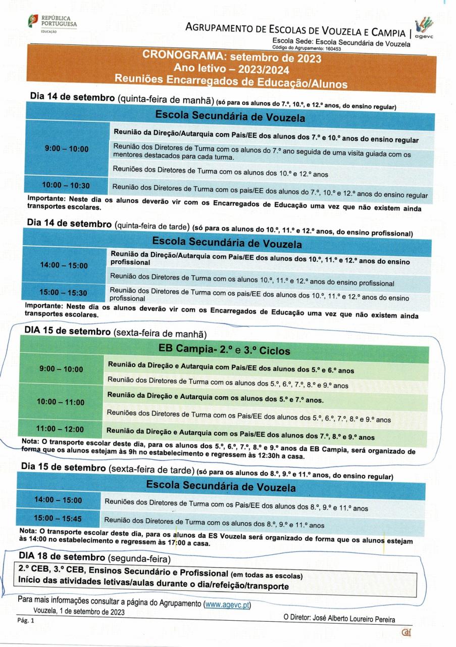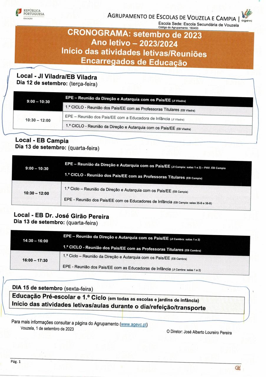 Ano Letivo 2023/2024 Início das atividades letivas/Reuniões